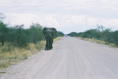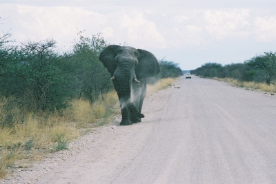 Elephant approaching us along the road |